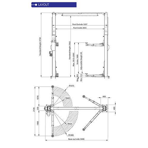 Chiều rộng tổng thể : 3440 mm (Đo từ mép ngoài hai đế trụ)